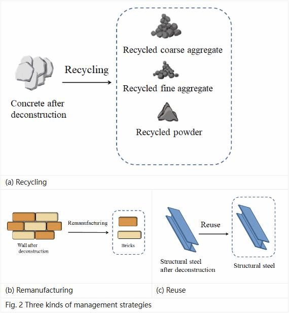 雷斌教授團(tuán)隊(duì)基于生命周期評(píng)價(jià)(LCA)理論,以節(jié)能潛力(CSP)為評(píng)價(jià)指標(biāo),研究了四種不同的處理策略(即再循環(huán)、再制造、再利用和綜合策略)對(duì)各種建筑結(jié)構(gòu)(包括框架、框架-剪力墻、剪力墻和輕鋼結(jié)構(gòu))的節(jié)能效益。結(jié)果表明,與傳統(tǒng)的拆除和垃圾填埋處理方法相比,本研究對(duì)結(jié)構(gòu)建筑實(shí)施綜合管理策略可減少150.7至246.8 kgCO2-e/m2的碳排放,減碳量是直接填埋碳排放量的11.9-3.8倍。在四種結(jié)構(gòu)中,輕鋼結(jié)構(gòu)的CSP最大,達(dá)到73.75%—77.24%,其次是框架-剪力墻結(jié)構(gòu)(42.67%—46.93%)、框架結(jié)構(gòu)(41.19%—45.11%)和剪力墻結(jié)構(gòu)的CSP(39.00%—43.79%)。當(dāng)建筑使用壽命為50年時(shí),四種結(jié)構(gòu)建筑的所有CSP都顯著增加,此時(shí)是對(duì)建筑進(jìn)行解構(gòu)最合理的方法。