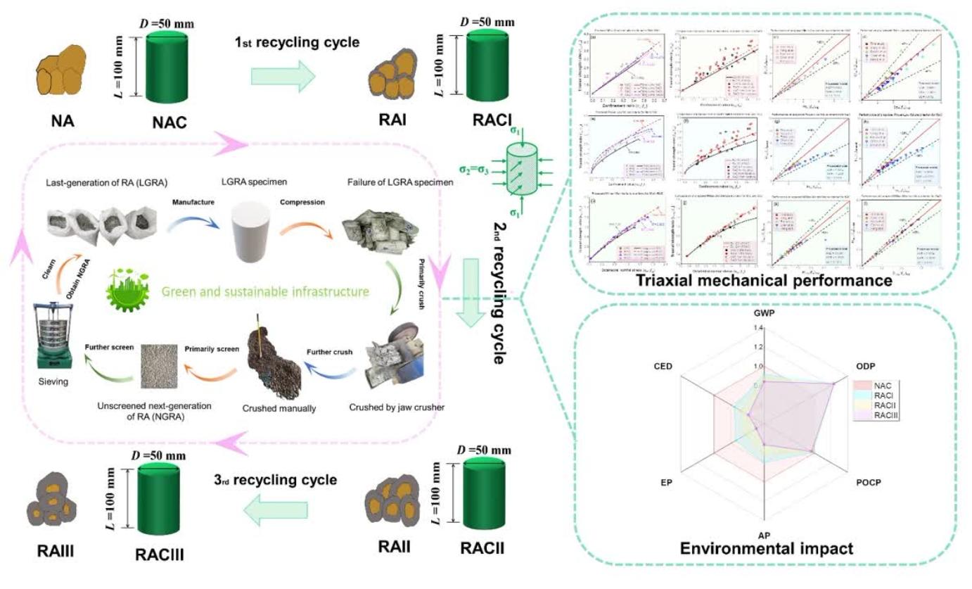 雷斌教授團(tuán)隊(duì)對(duì)多次再生骨料混凝土(Multi-RAC)的三軸力學(xué)性能和環(huán)境影響進(jìn)行了研究,研究結(jié)果表明,Multi-RAC的三軸破壞模式與天然骨料混凝土相似。其次,通過(guò)方差分析和斯皮爾曼相關(guān)性檢驗(yàn)兩種數(shù)學(xué)分析方法共同證明,峰值應(yīng)力、峰值應(yīng)變、彈性模量等自變量與橫向圍壓、再生次數(shù)等因變量存在顯著相關(guān)性。另外基于多元回歸混合模型,較好預(yù)測(cè)恒定圍壓和再生次數(shù)下的Multi-RAC的峰值應(yīng)力、峰值應(yīng)變和彈性模量的回歸關(guān)系。隨后引入循環(huán)再生因子,借助改良的高級(jí)非線性彈塑性本構(gòu)模型,成功預(yù)測(cè)Multi-RAC的三軸力學(xué)性能。對(duì)比分析表明,與Mohr-Coulomb、Power-law和William-Warnke等傳統(tǒng)失效準(zhǔn)則相比,由彈塑性模式導(dǎo)出的高階非線性失效準(zhǔn)則具有更好的適應(yīng)性,可以正確預(yù)測(cè)混凝土三軸壓縮下的應(yīng)力和應(yīng)變特性。在環(huán)境影響方面,除ODP外,Multi-RAC的所有環(huán)境影響指標(biāo)(GWP、POCP、AP、EP和CED)都隨著再生次數(shù)的增加而降低,其中CED和EP的降低效果最顯著。