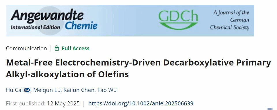 本網訊(化學化工學院)近日,我?;瘜W化工學院蔡琥教授團隊和吳濤教授課題組在電化學有機合成領域取得新進展,創新性地開發了一種電化學驅動的無需金屬催化劑和傳統氧化劑參與的烯烴伯烷基-烷氧基化反應,研究成果以“Metal-Free Electrochemistry-Driven Decarboxylative Primary Alkyl-alkoxylation of Olefins”為題發表在Angewandte Chemie International Edition上。我校化學化工學院陸美群博士為該論文第一作者,蔡琥教授和吳濤教授為共同通訊作者,南昌大學為第一署名單位和通訊單位。